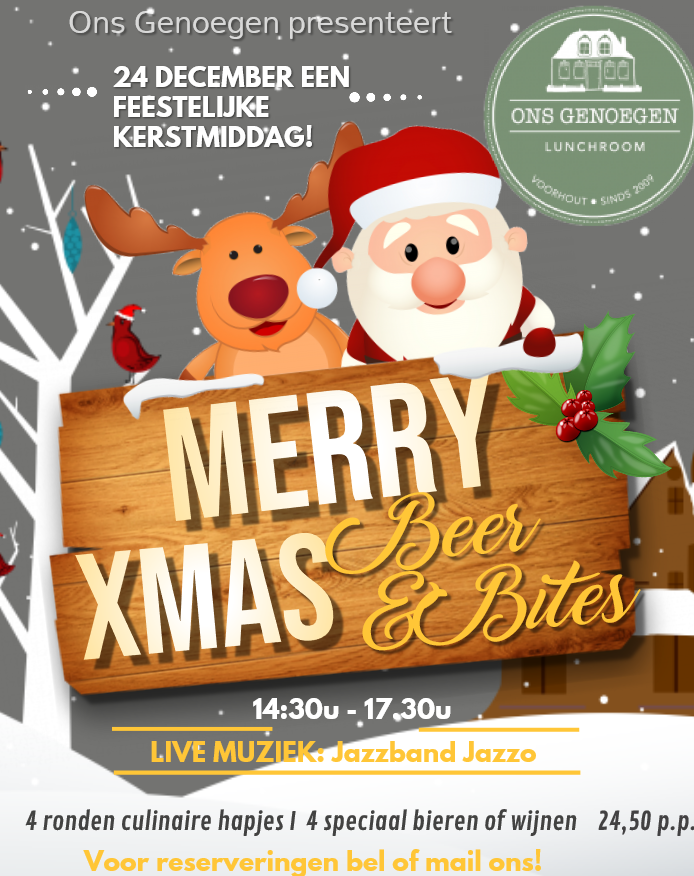 Komt u ook met vrienden/familie/kennissen de Kerst inluiden onder het genot van een hapje, drankje en live muziek (jazzband Jasso) bij Ons Genoegen op 24 december?